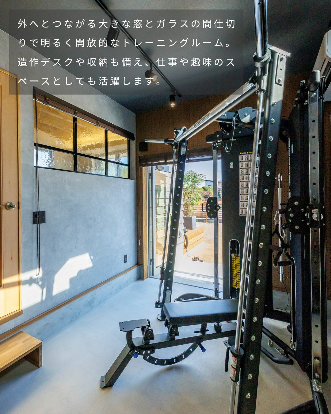 トレーニングルームを備え、さらに帰宅時のスムーズな動線や家事のしやすさを考えた間取りが魅力な住まいです。