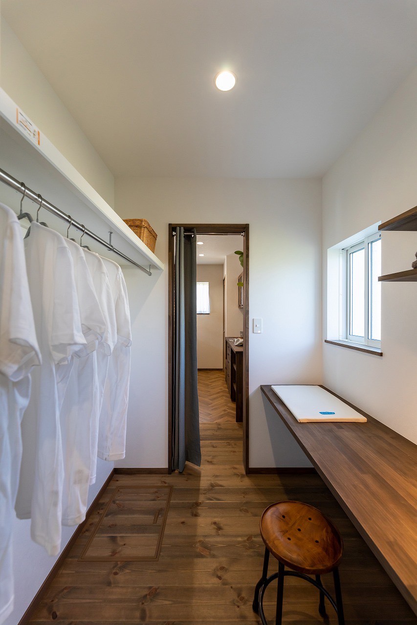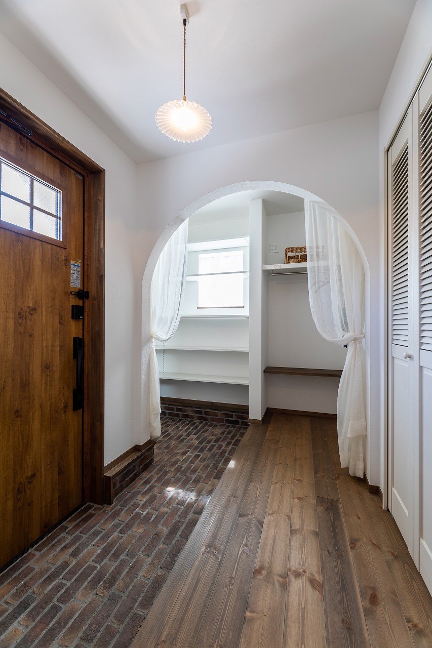 レースカーテンで仕切れる大きなアーチが印象的な大容量のシューズクローゼット。