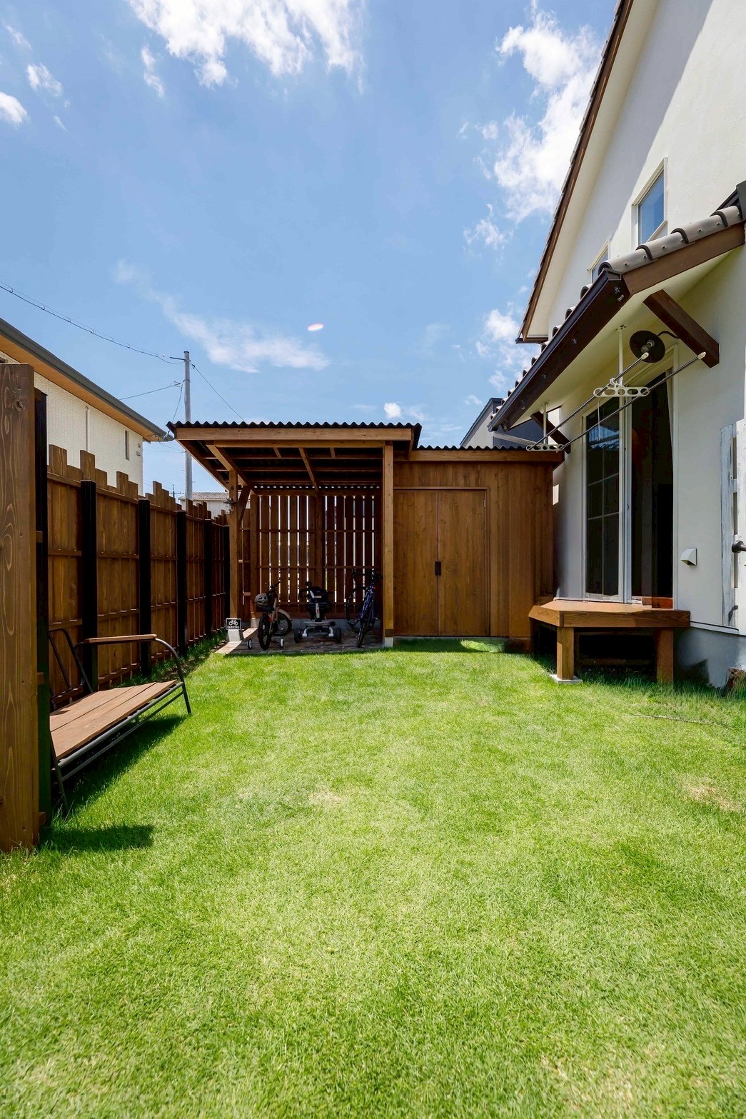 板塀で区切ることでお子様も安心して遊べるお庭。
