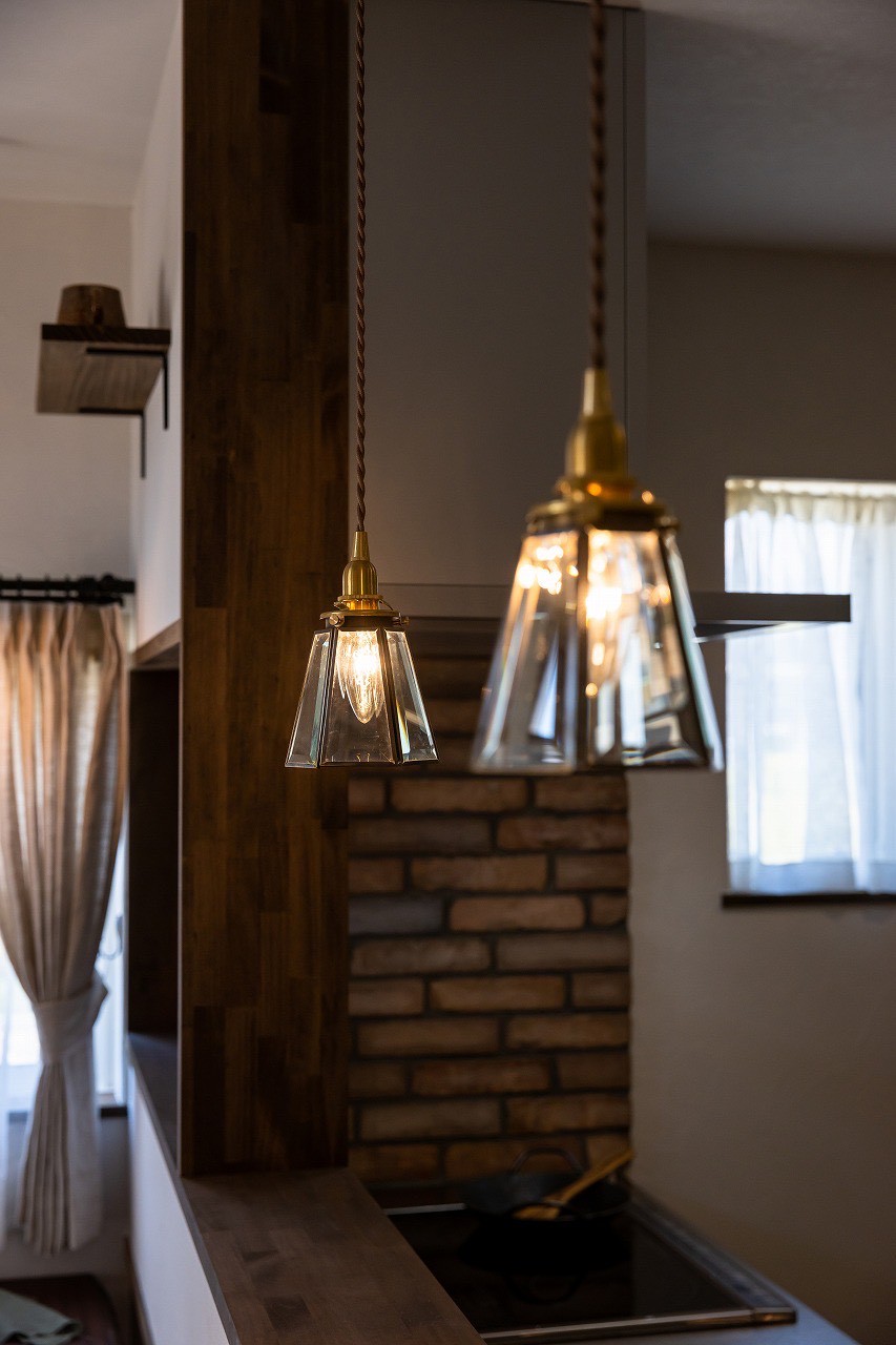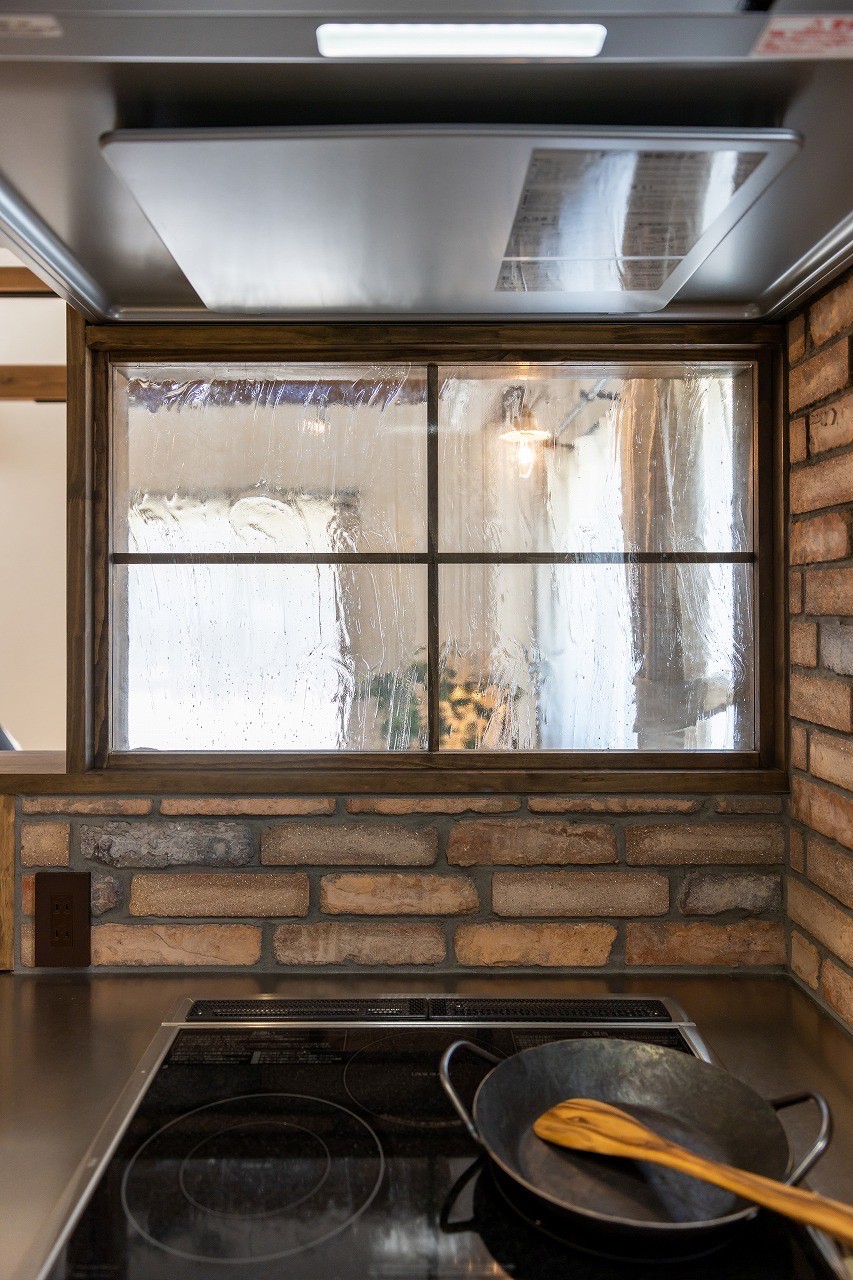 コンロ前には格子窓を。揺らぎ感のあるデザインガラスが素敵です。