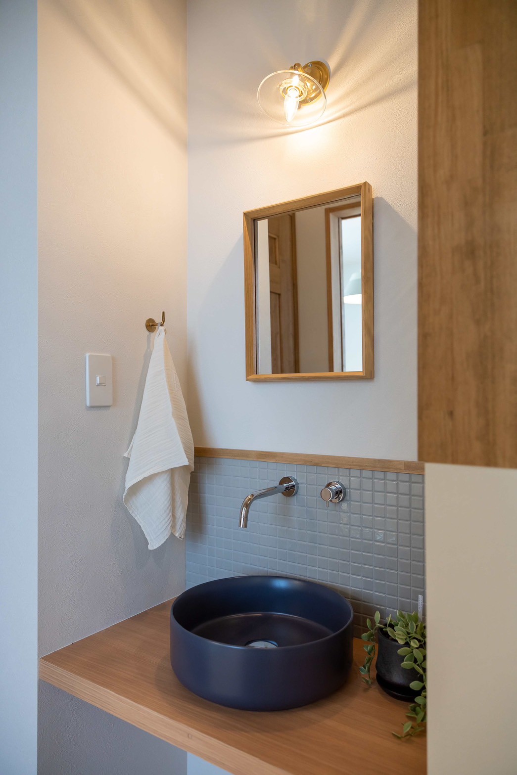 洗練されたネイビーのボウルや真鍮の照明など、一つひとつのパーツにこだわりを詰め込みました。一日の始まりと終わりを過ごす場所だからこそ、使い勝手と美しさを両立させています。 -