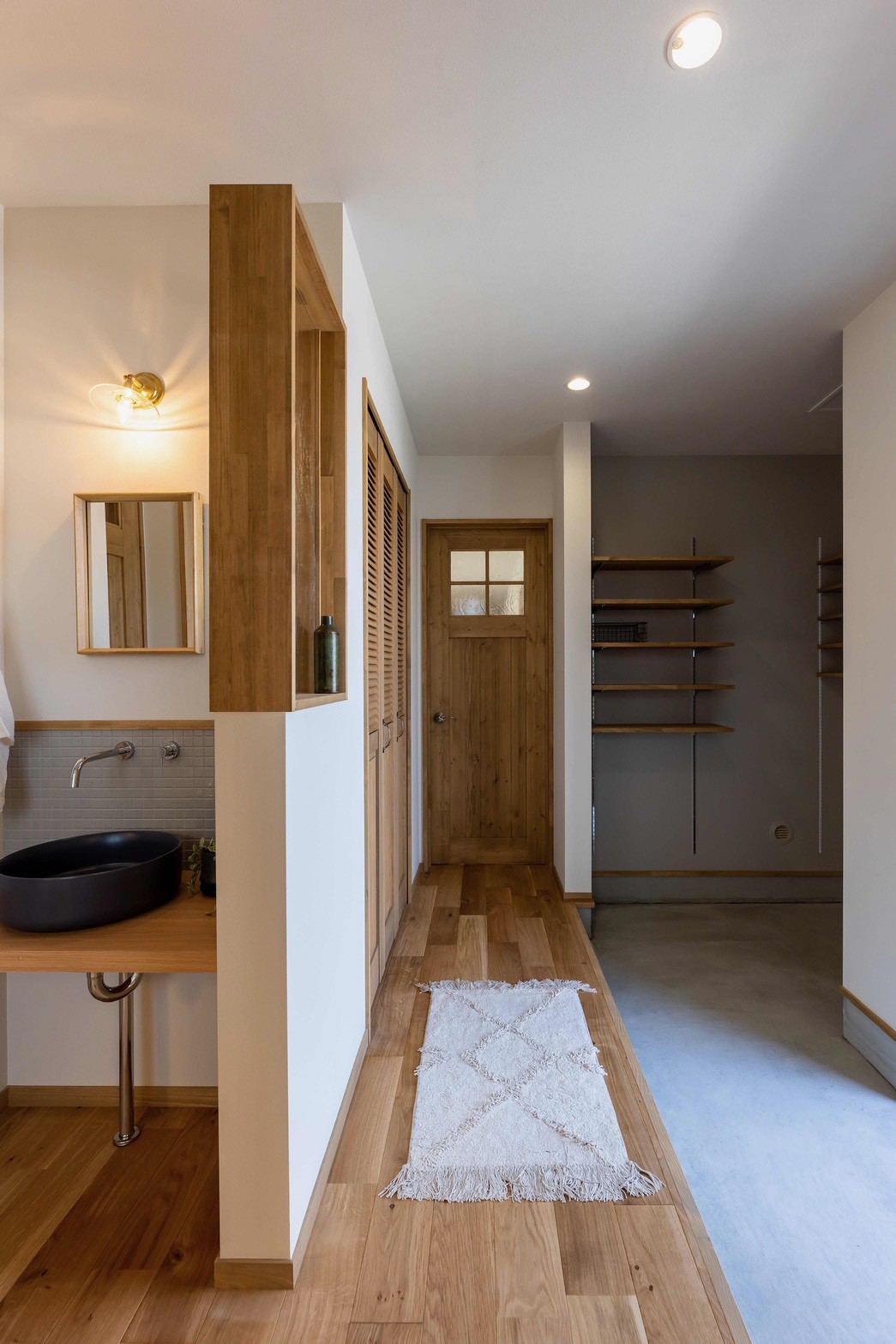 玄関を開けると、無垢材のフローリングが心地よく迎え入れてくれるエントランス。左手の造作洗面台は、帰宅後の手洗いや身だしなみに便利です。廊下奥へと続く視線が、住まい全体への期待感を高めます。
