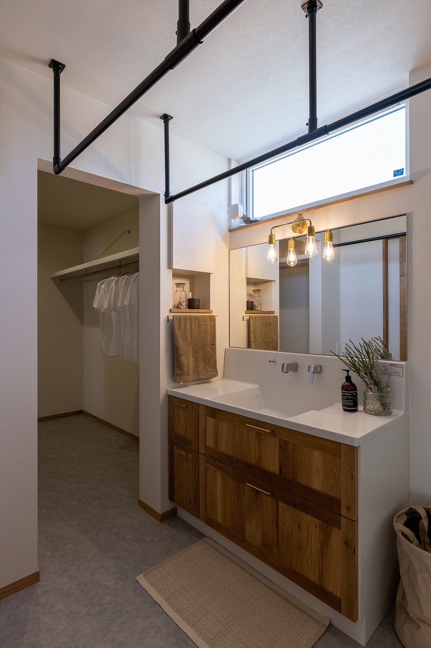 広々とした造作洗面台の上部には、ブラックのアイアンバーを設置し、室内干しもスマートに。