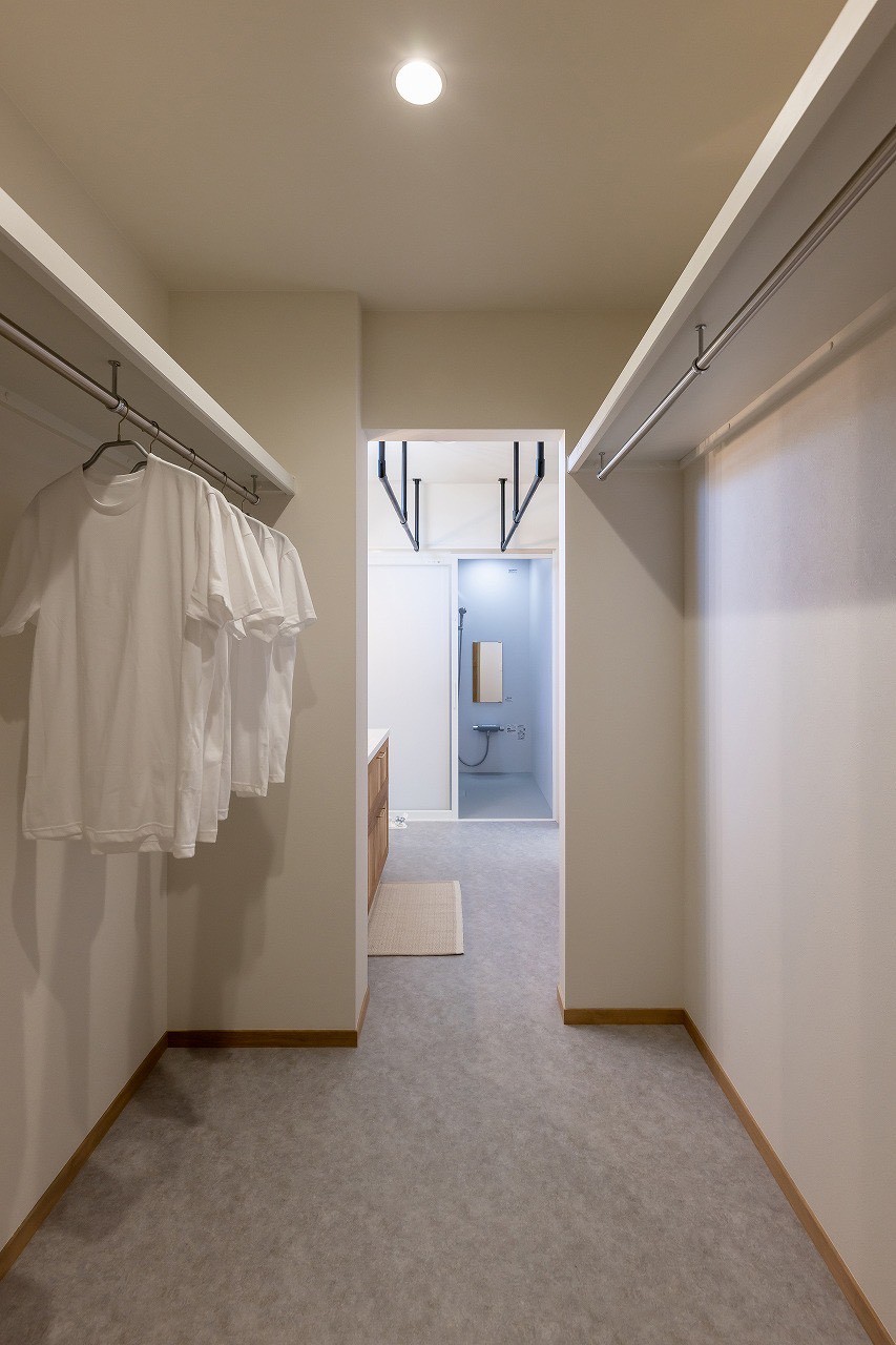 収納力抜群のウォークインクローゼットから、洗面・脱衣室、さらに浴室へと続く、流れるような動線。