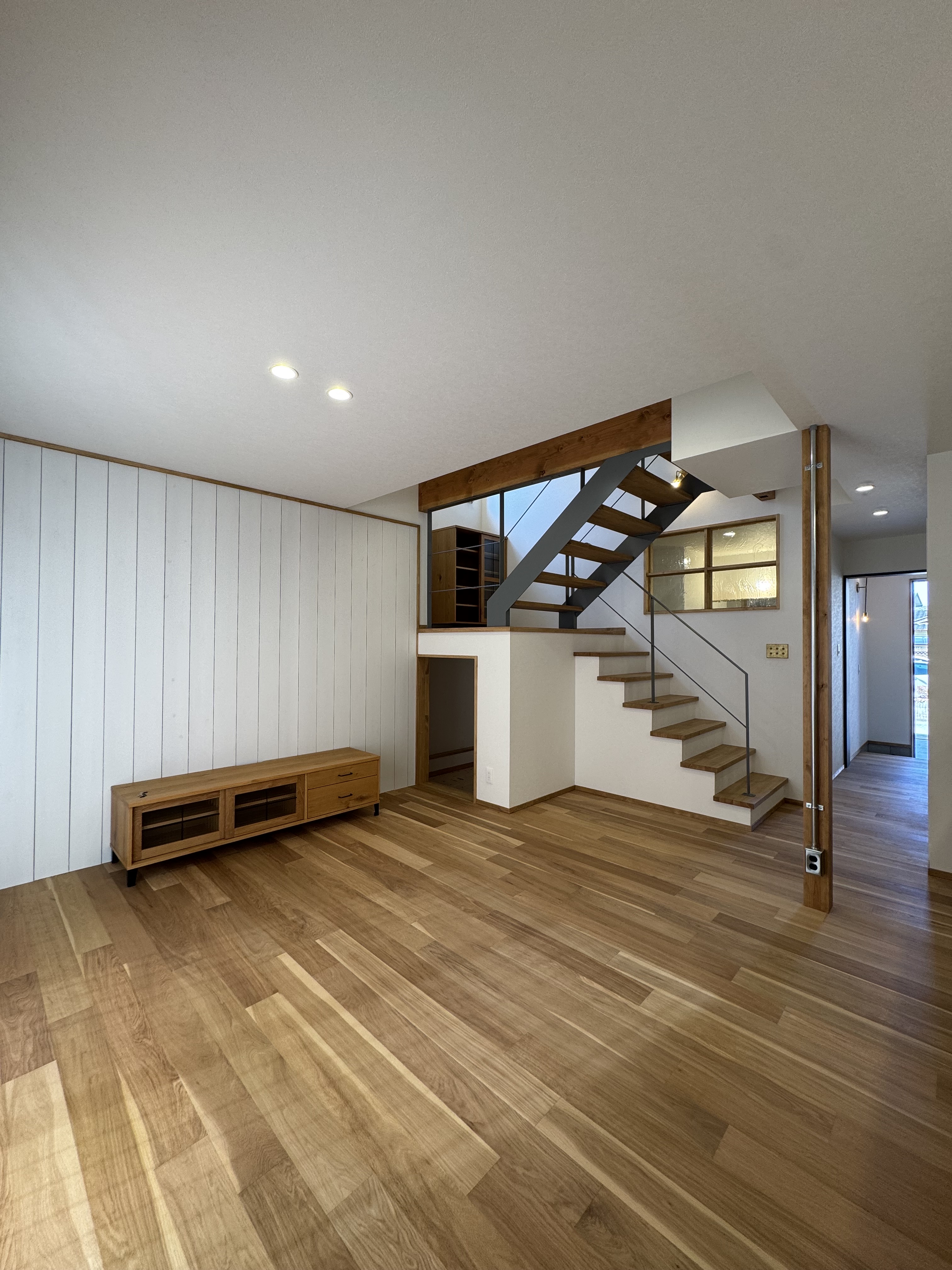 テレビボードの後ろの板張りやスキップフロアなど拘りが詰まったお家です♪
